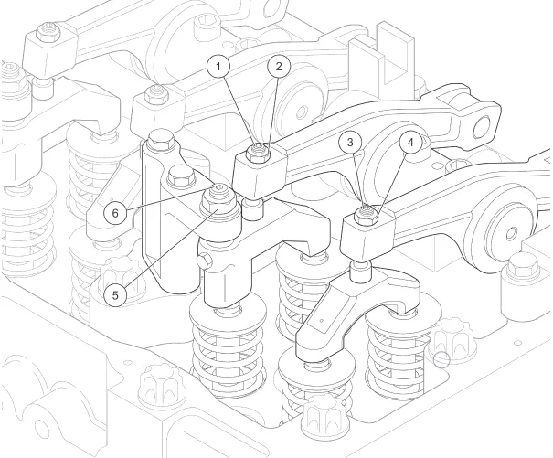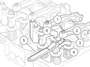 - Закручивайте регулировочный винт (1), пока щуп 0,5 мм (6) между шаровым подпятником (3) и штангой (4) клапана не будет двигаться с незначительным сопротивлением