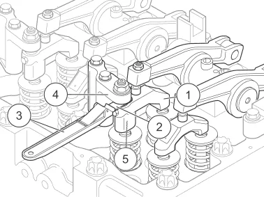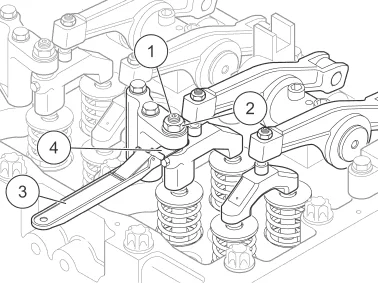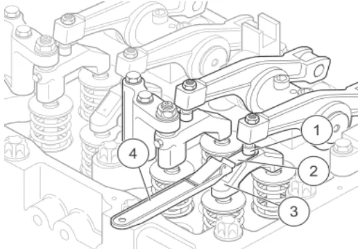 - Вставьте щуп 0,6 мм (2) между контропорой (4) и штангой (1) клапана. Если зазор не составляет 0,6 мм, то следует отрегулировать зазор EVB