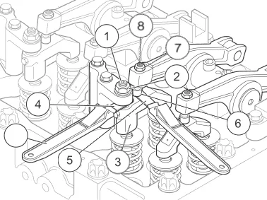 - Закручивайте регулировочный винт (8), пока щуп 0,8 мм (5) между шаровым подпятником (6) и штангой (3) клапана не будет двигаться с незначительным сопротивлением